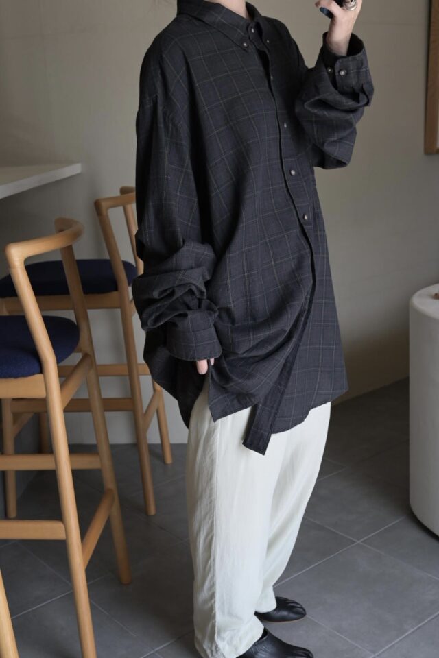 レーヨンのような、とろみのある柔らかな素材で、着るとすっきりと落ち感があります。