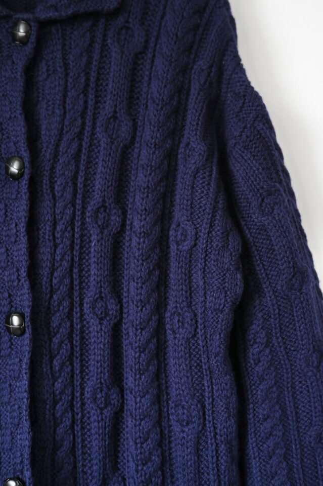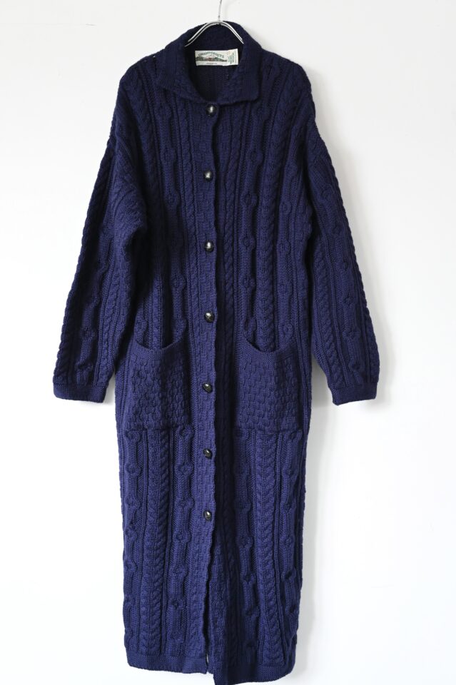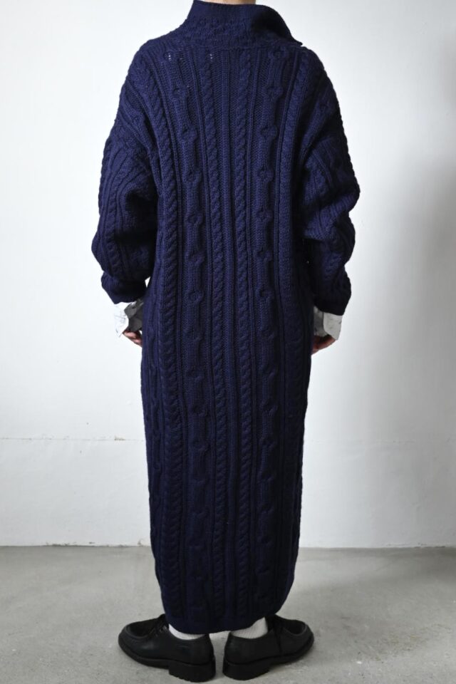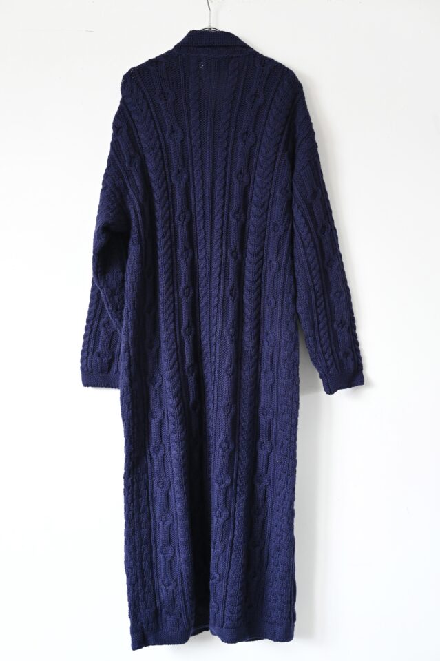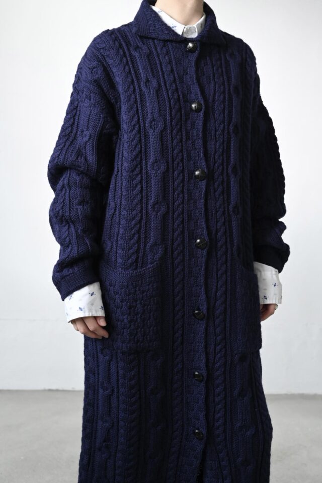この手のケーブル編みでは珍しいロングコート。